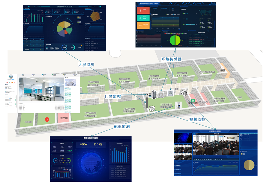 智慧物聯實驗室應用平臺結合校園地圖、實驗室房間分布圖、實驗室的教學管理、實驗室預約管理、大型儀器預約管理、門禁系統、視頻監控系統、監測傳感器物聯、智能電表系統等,實現對實驗室場所、人員、設備、環境與安全保障的綜合實時管控,實現對實驗室存在的隱患風險智能感知、即時響應、及時預警,并通過大數據的分析為管理方提供有意義的決策信息。同時,通過可視化電子屏將實驗室的綜合信息展示,提供用戶便捷互動操作,綜合提升實驗室的智能化管理水平。